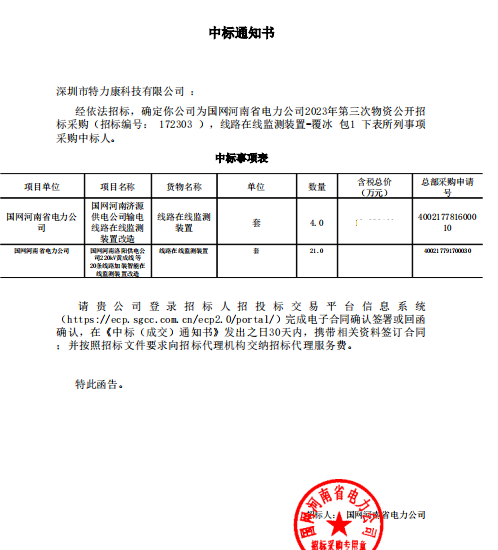 特力康中標國網河南省電力公司2023年第三次物資公開招標