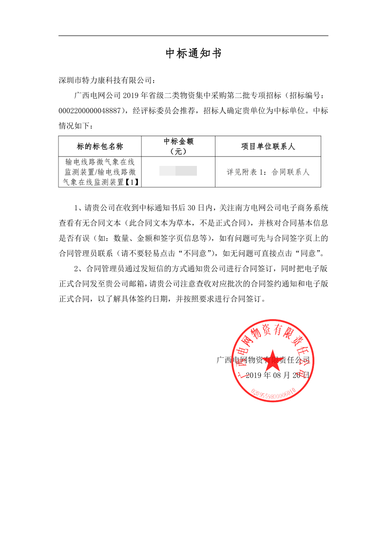 廣西電網公司 2019 年省級二類物資集中采購第二批專項招標項目評審工作已結束,經評標委員會推薦,招標人確定我司為中標單位。