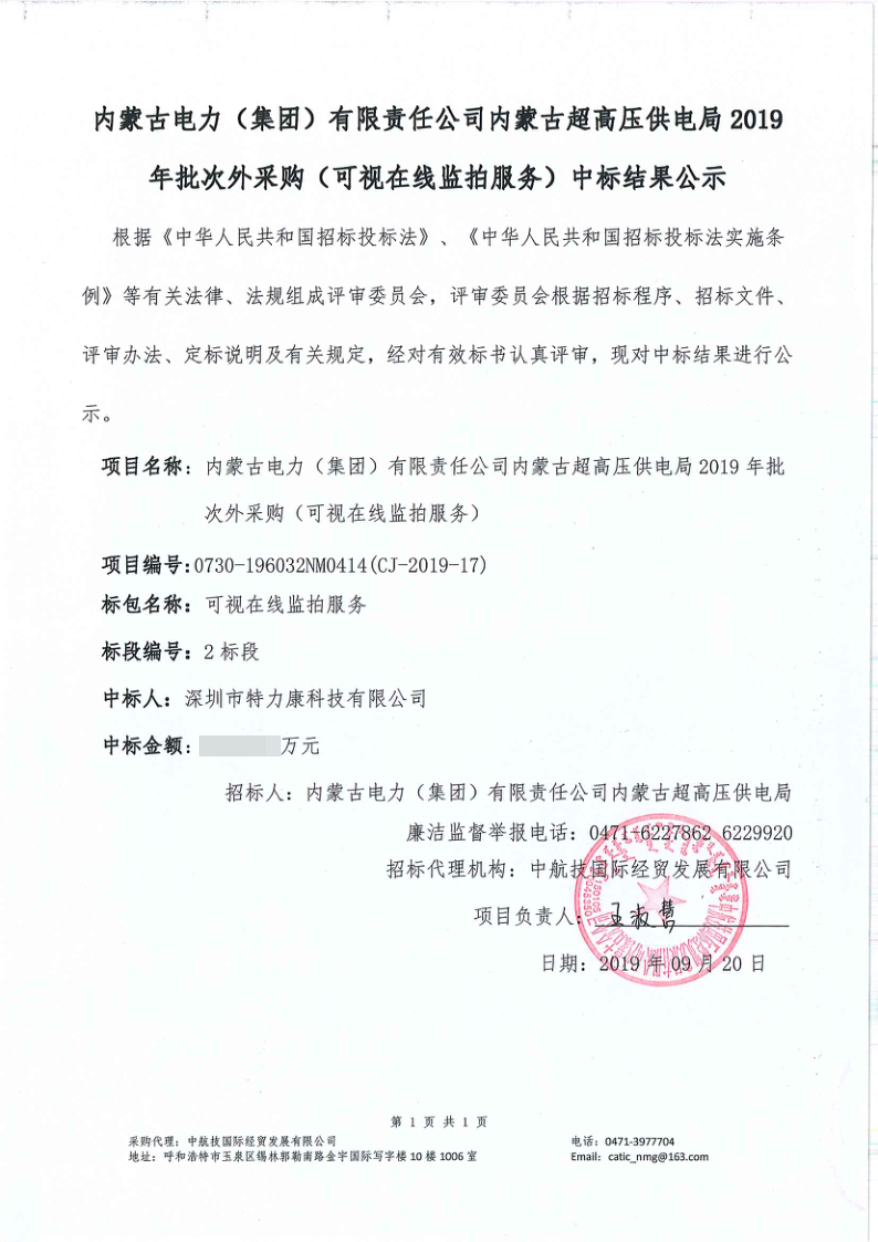經審委員會根據招標程標次評審、定標說明及有關規定,經對有效標書認真評審,確定我司為內蒙古電力(集團)有限責任公司內蒙古超高壓供電局2019年批次外采購(可視在線監測服務)項目中標單位。