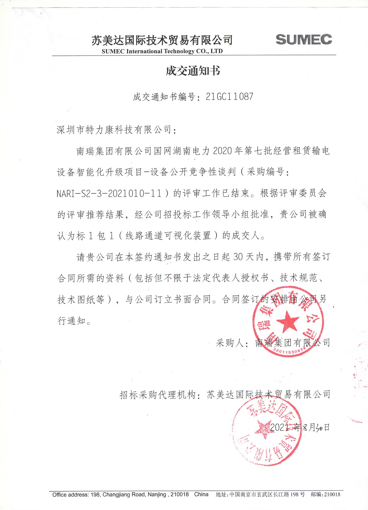 南瑞集團有限公司國網(wǎng)湖南電力2020年第七批經(jīng)營租賃輸電設(shè)備智能化升級項目-設(shè)備公開競爭性談判(采購編號:NARI-S2-3-2021010-11 )的評審工作已結(jié)束。根據(jù)評審委員會的評審?fù)扑]結(jié)果,經(jīng)公司招投標(biāo)工作領(lǐng)導(dǎo)小組批準(zhǔn),我司被確認(rèn)為標(biāo)1包1 (線路通道可視化裝置)的成交人。中標(biāo)公告如下: