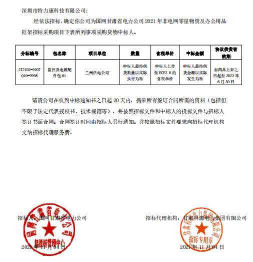 特力康科技中標國網甘肅電力公司電網零星物資框架招標采購